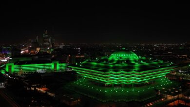 مباني وزارة الداخلية وإمارات المناطق والقطاعات الأمنية تكتسي باللون الأخضر ابتهاجًا بذكرى يوم التأسيس