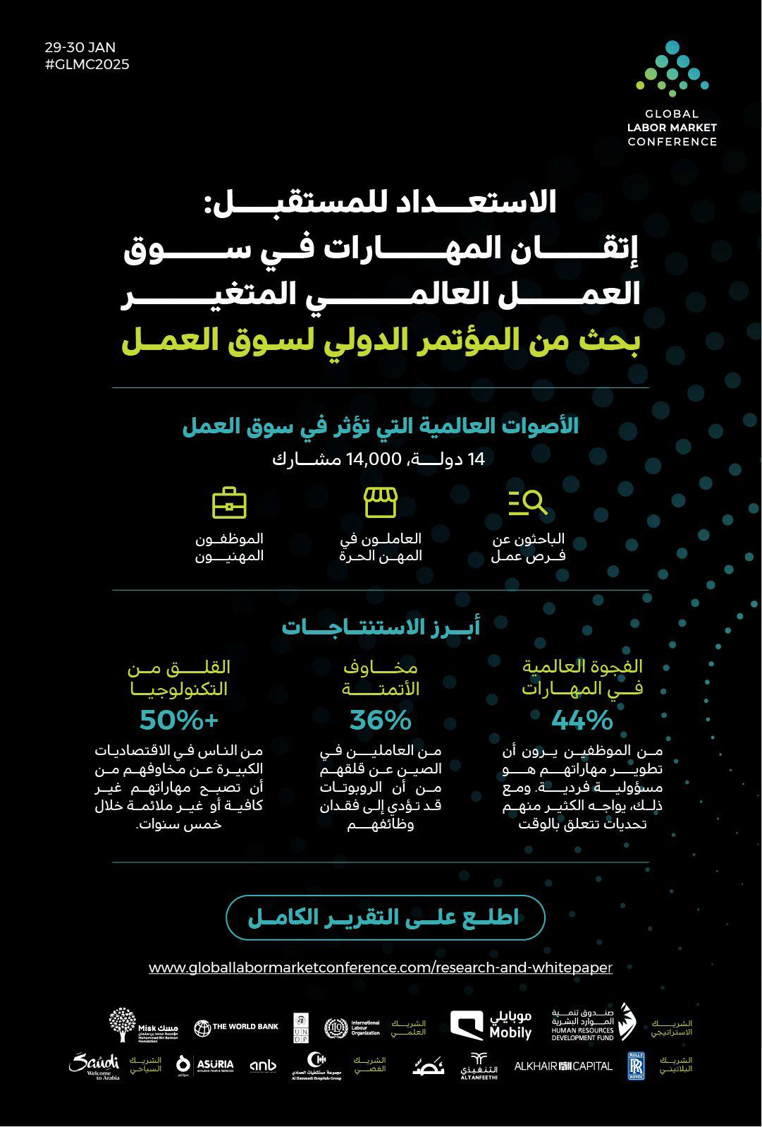 يُذكر أن النسخة الثانية من المؤتمر الدولي لسوق العمل ستنعقد في مركز الملك عبد العزيز الدولي للمؤتمرات بالرياض في 29 و30 يناير 2025. سيجمع الحدث أكثر من 5000 مشارك من مختلف أنحاء العالم، وبمشاركة أكثر من 200 متحدث بارز، بما في ذلك وزراء عمل من 40 دولة، ورؤساء تنفيذيين، وخبراء دوليين، وقادة القطاع العام من أكثر من 50 دولة لمناقشة أبرز التحديات والفرص في سوق العمل العالمي.