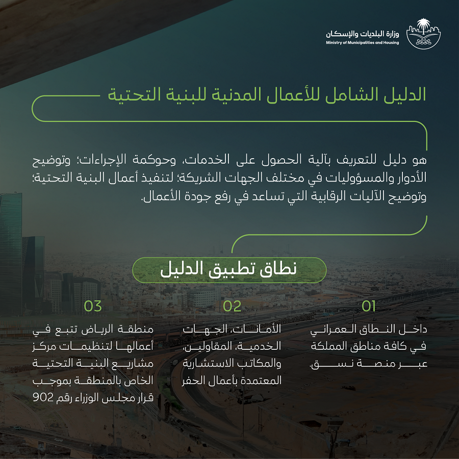 أصدرت وزارة البلديات والإسكان الدليل التنظيمي الشامل للأعمال المدنية للبنية التحتية؛ الذي يهدف إلى معالجة التحديات المؤثرة في المشهد الحضري، وتعزيز كفاءة أعمال مشاريع البنية التحتية، حيث يأتي الدليل ضمن جهود الوزارة للارتقاء بجودة خدمات البنية التحتية بمدن المملكة، والحدّ من مظاهر التشوه البصري.