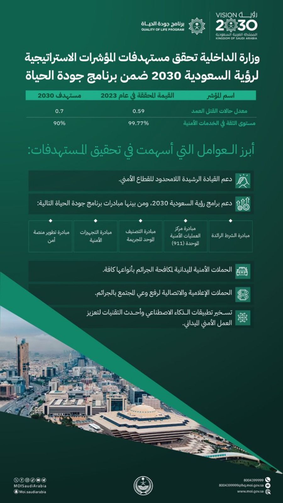 حققت وزارة الداخلية نتائج مميزة في مؤشراتها الاستراتيجية لرؤية المملكة 2030 ضمن برنامج جودة الحياة، إذ ارتفعت مستويات الثقة في الخدمات الأمنية، بتحقيق مؤشر “مستوى الثقة في الخدمات الأمنية” قيمة فعلية بلغت 99.77 % في عام 2023 تجاوزت مستهدف 2030 بنسبة 111%، فيما انخفضت معدلات القتل العمد بتحقيق مؤشر “معدل حالات القتل العمد” لكل 100.000 نسمة” نسبة فعلية مقدارها 0.59 والتي تجاوزت مستهدف 2030 بنسبة 119%.