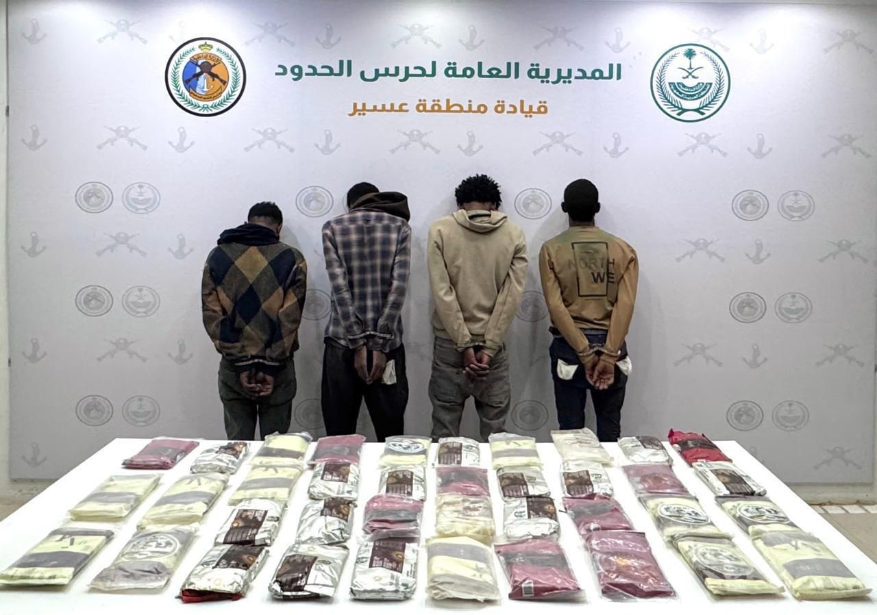 في إطار المهام الأمنية لحراسة حدود المملكة البرية والبحرية، أحبطت المديرية العامة لحرس الحدود في عدة عمليات أمنية محاولات تهريب (1.3) طن من مادة الحشيش المخدر و(1,388,622) قرصًا خاضعًا لتنظيم التداول الطبي و(136) طنًا من نبات القات المخدر، وقبضت على مهربيها بمناطق جازان وعسير ونجران، وهم (959) مخالفًا لنظام أمن الحدود من الجنسية الإثيوبية و(849) مخالفًا لنظام أمن الحدود من الجنسية اليمنية و(3) مخالفين لنظام أمن الحدود من الجنسيتين الصومالية والإرترية و(12) مواطنًا.