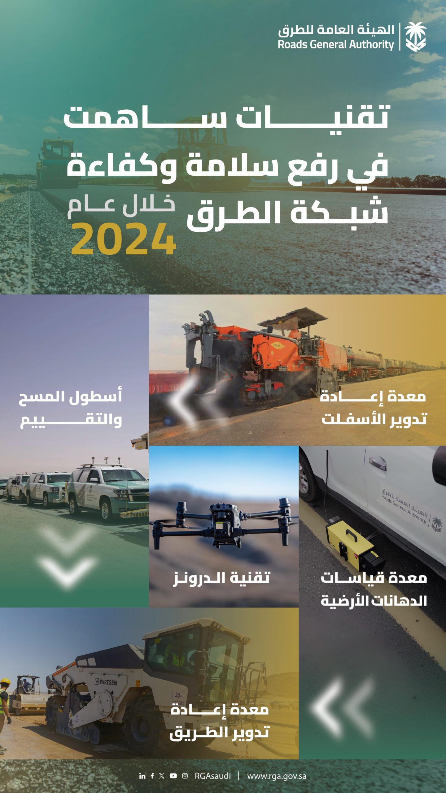 تبنت الهيئة العامة للطرق خلال العام 2024، مجموعة من التقنيات الحديثة التي تسهم في رفع مستوى السلامة والكفاءة على شبكة الطرق، في خطوة تعكس التزامها بتعزيز البنية التحتية للطرق في المملكة.