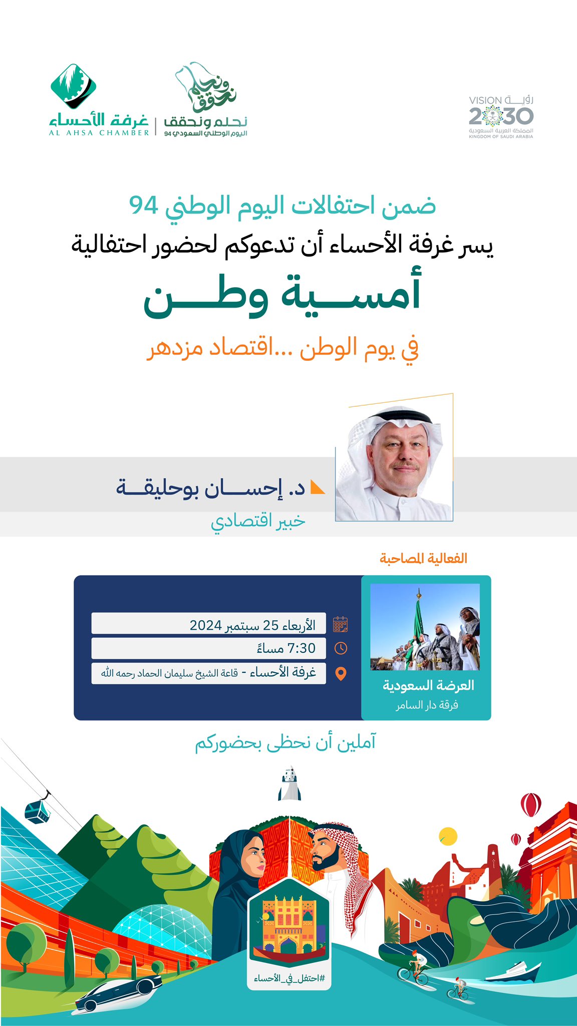 تُنظّم غرفة الأحساء ضمن روزنامة الفعاليات الخاصة باحتفالات باليوم الوطني الـ94 في الأحساء والتي تحظى بدعم ورعاية كريمة من صاحب السمو الملكي الأمير سعود بن طلال بن بدر محافظ الأحساء، برنامج “أمسية وطن 2024″، وذلك مساء الأربعاء 25 سبتمبر، بقاعة الشيخ سليمان الحماد -رحمه الله- بمقر الغرفة.