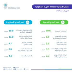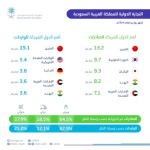 الهيئة العامة للإحصاء: ارتفاع الصادرات غير البترولية بنسبة 19.0% في يوليو 2024م