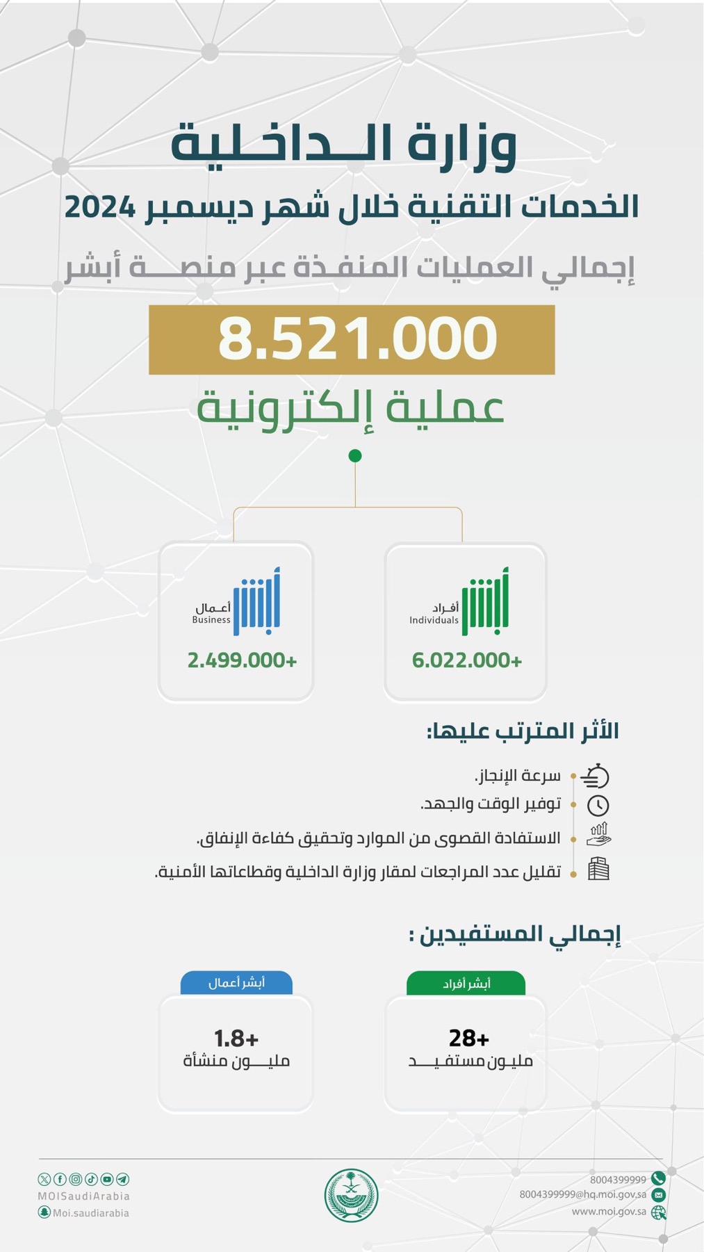 أكثر من 8.5 ملايين عملية إلكترونية عبر منصة “أبشر” في ديسمبر 2024