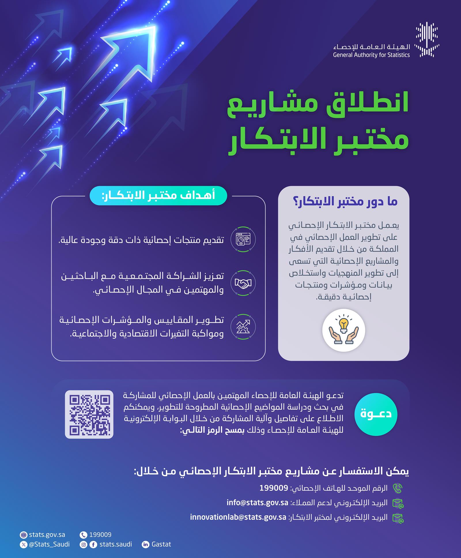 تُطلق الهيئة العامة للإحصاء ، مختبر الابتكار كأول مختبر ابتكار متخصص في الإحصاء بالمنطقة؛ الذي يهدف إلى تعزيز الشراكة المجتمعية مع الباحثين والمهتمين في المجال الإحصائي وعلوم البيانات من منسوبي الجامعات، والجمعيات الإحصائية، والمراكز البحثية، ومراكز الابتكار، من خلال تمكينهم من الابتكار الإحصائي.
