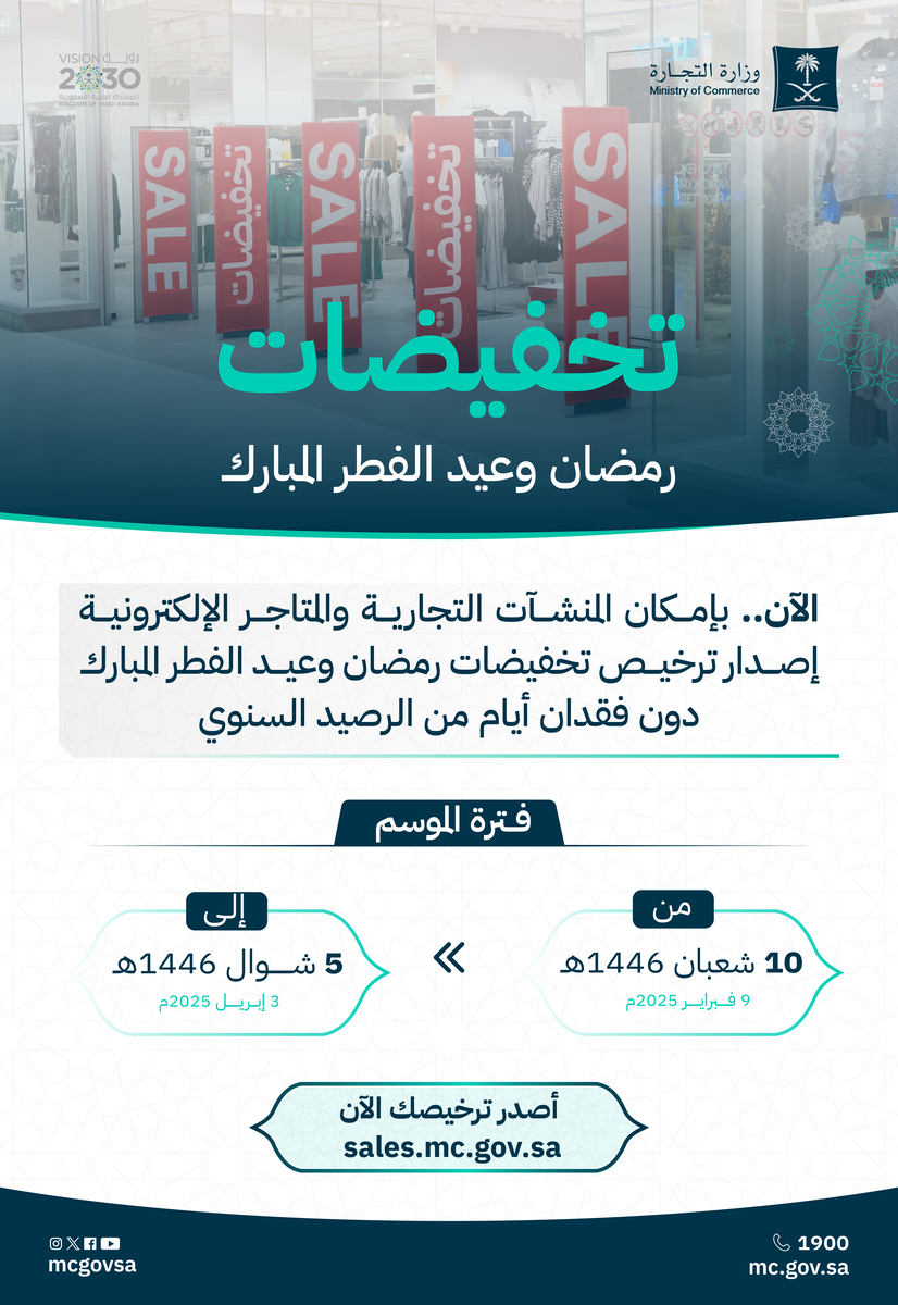 ويُمكن للمنشآت التجارية والمتاجر الإلكترونية الآن التقدم للحصول على تراخيص التخفيضات بشكل إلكتروني من خلال: sales.mc.gov.sa.