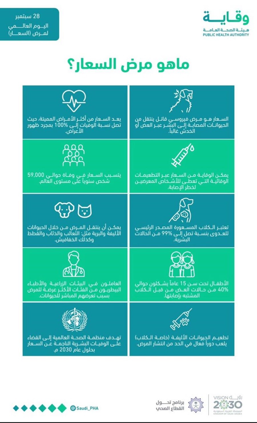 أطلقت هيئة الصحة العامة “وقاية” حملة توعوية للتعريف بخطورة مرض “السعار” وطرق الوقاية منه.