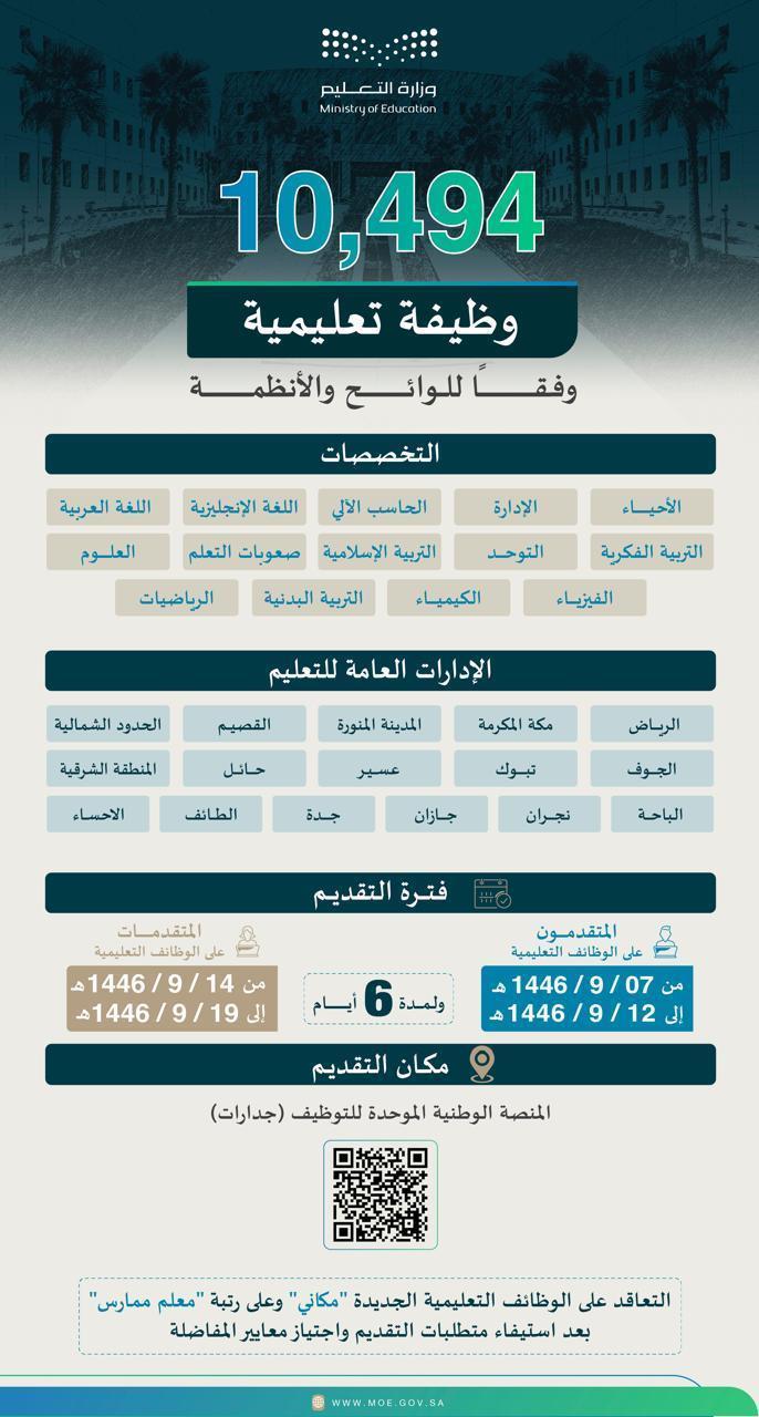 أعلنت وزارة التعليم فتح التقديم على (10,494) وظيفة تعليمية بنظام التعاقد المكاني في جميع الإدارات العامة للتعليم، للعام الدراسي 1447هـ، من خلال المنصة الوطنية الموحدة للتوظيف “جدارات”، وذلك لجميع الخريجين ووفق تخصصات محددة لسد الاحتياج.