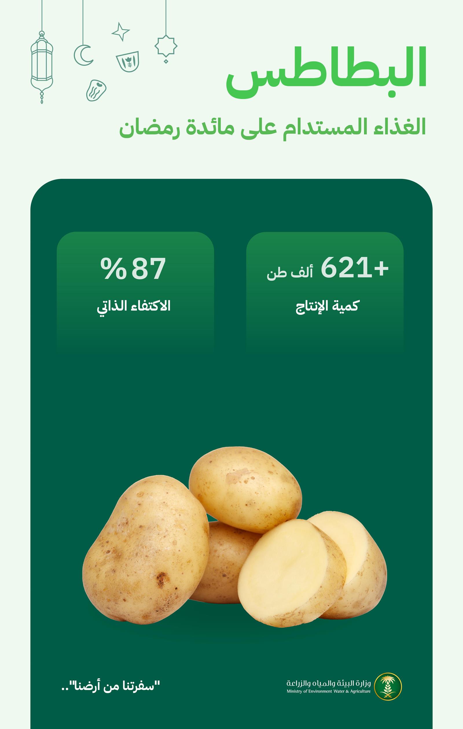 وأوضحت الوزارة خلال حملتها “سفرتنا من أرضنا” أن المملكة حققت نسبة اكتفاء ذاتي من البطاطس تبلغ (87%)، مما يجسد جودة الإنتاج المحلي وكفاءته في تلبية الطلب المحلي وتقليل الاعتماد على الاستيراد، تماشيًا مع مستهدفات الأمن الغذائي في المملكة.