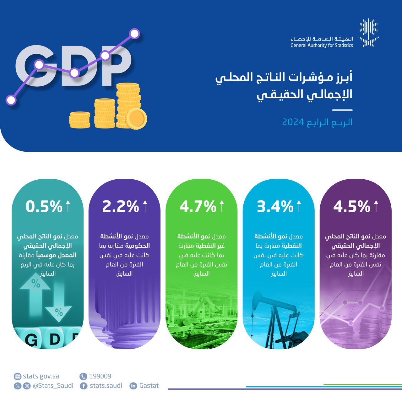 وفي شأن التقديرات الربعية حقَّق الناتج المحلي الإجمالي الحقيقي ارتفاعًا خلال الربع الرابع من عام 2024 بنسبة 4.5 % مقارنةً بالربع المماثل من العام السابق، ويعزى ذلك إلى النمو على مستوى جميع الأنشطة الاقتصادية، حيث حققت الأنشطة غير النفطية نموًا بنسبة 4.7%، فيما حققت الأنشطة النفطية نموًا بنسبة 3.4 % ، بالإضافة إلى نمو الأنشطة الحكومية بنسبة2.2 %على أساس سنوي.