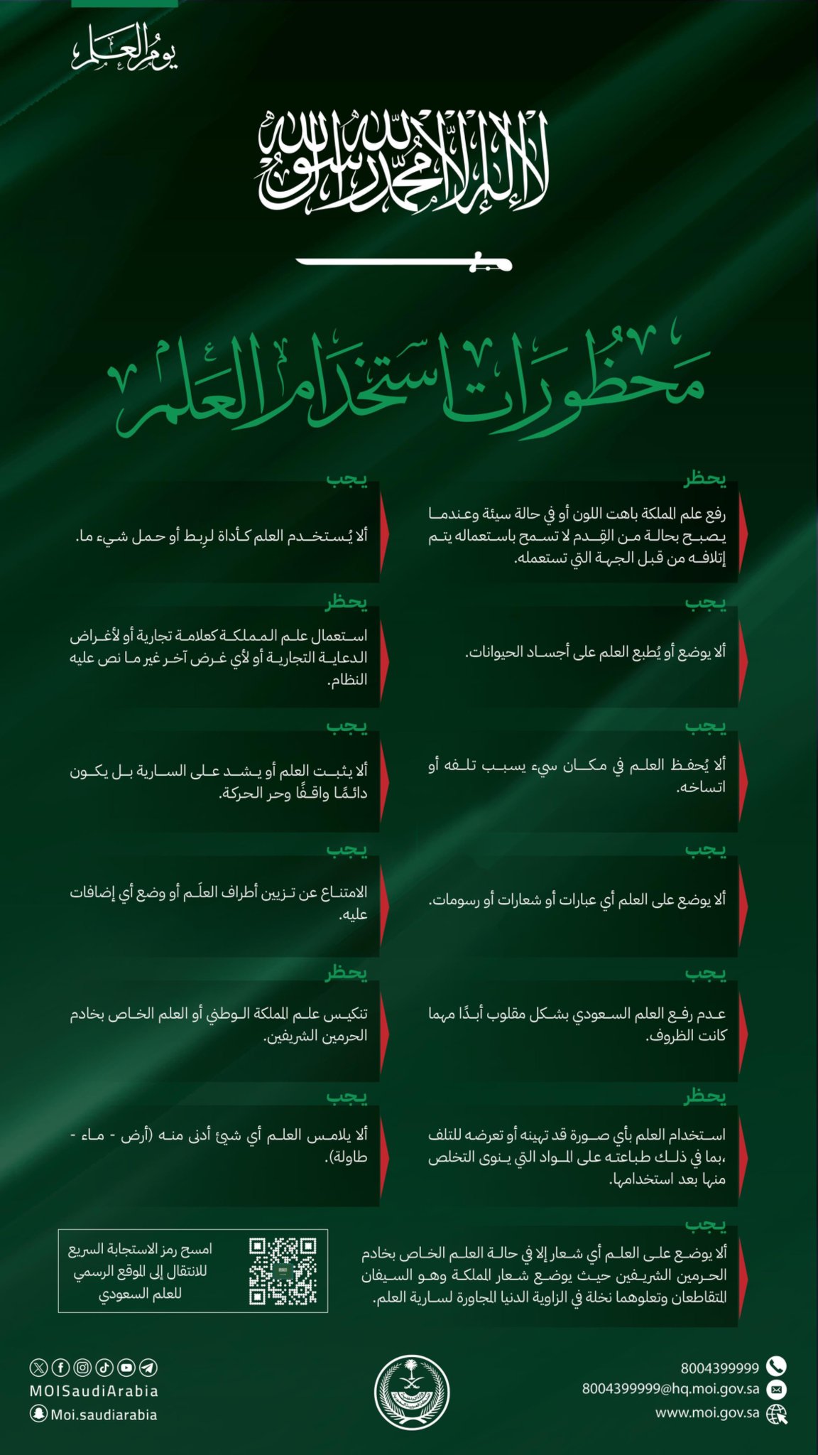 أوضحت وزارة الداخلية السعودية مجموعة من الضوابط والمحظورات المتعلقة باستخدام العلم الوطني، مشددةً على ضرورة احترامه والالتزام بالتعليمات المنظمة لذلك.