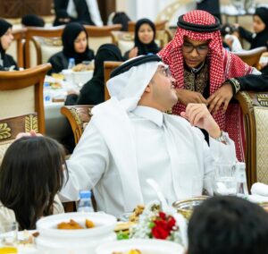 حفظها الله – لأبنائها الأيتام في المملكة، والاهتمام بشؤونهم وتوفير احتياجاتهم، معربًا سموّه عن سعادته بمشاركة هذه الفئة الغالية في مائدة الإفطار.