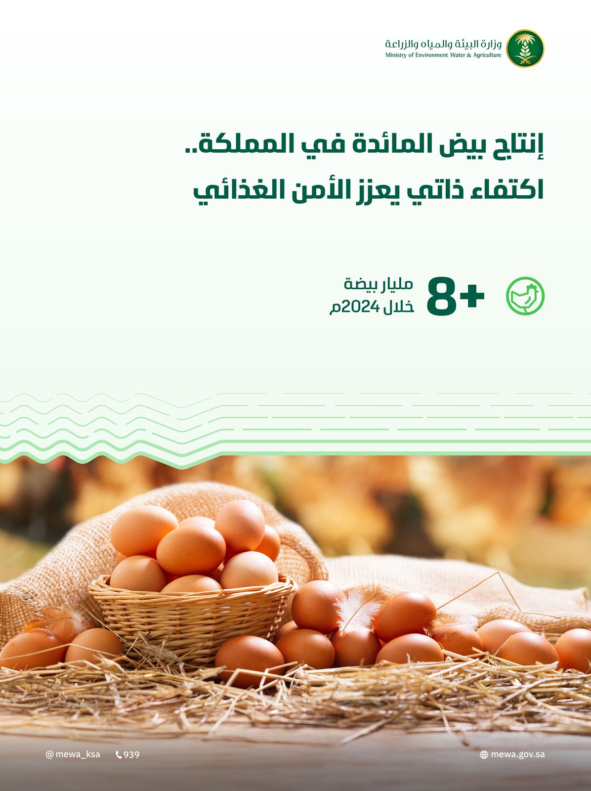 وأكدت الوزارة أن إنتاج المملكة من بيض المائدة بلغ نحو (8) مليارات بيضة خلال عام 2024م، مما يعد مكون غذائي أساسي في وجباتنا اليومية، كما يدخل في تحضير العديد من الوجبات الأساسية مثل المعجنات والفطائر والأكلات المتنوعة، مبينة جهودها في رفع جودة الأغذية والوقوف على سلامتها، وضمان وفرتها في الأسواق.