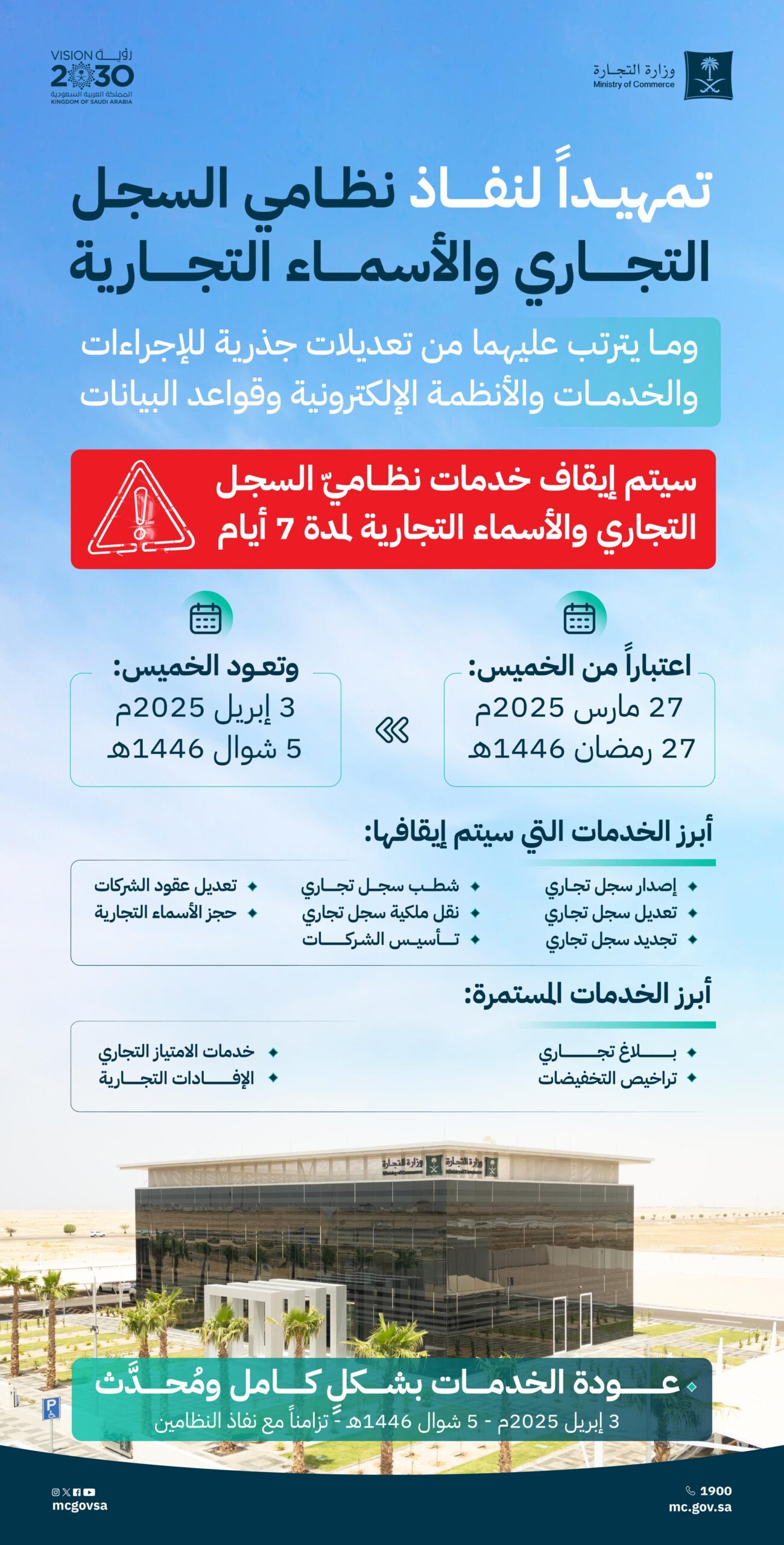 حثت وزارة التجارة عملاء قطاع الأعمال الراغبين في الاستفادة من خدمات نظاميّ السجل التجاري والأسماء التجارية إلى إنجاز طلباتهم وجميع ما يرتبط بها، قبل الإيقاف التطويري المجدول للخدمات الحالية للنظامين اعتباراً من: يوم الخميس 27 رمضان 1446هـ الموافق 27 مارس 2025م، لمدة (7 أيام)، حيث سيتم اعادة تفعيل الخدمات وفق النظام الجديد يوم الخميس 5 شوال 1446هـ الموافق 3 إبريل 2025م.