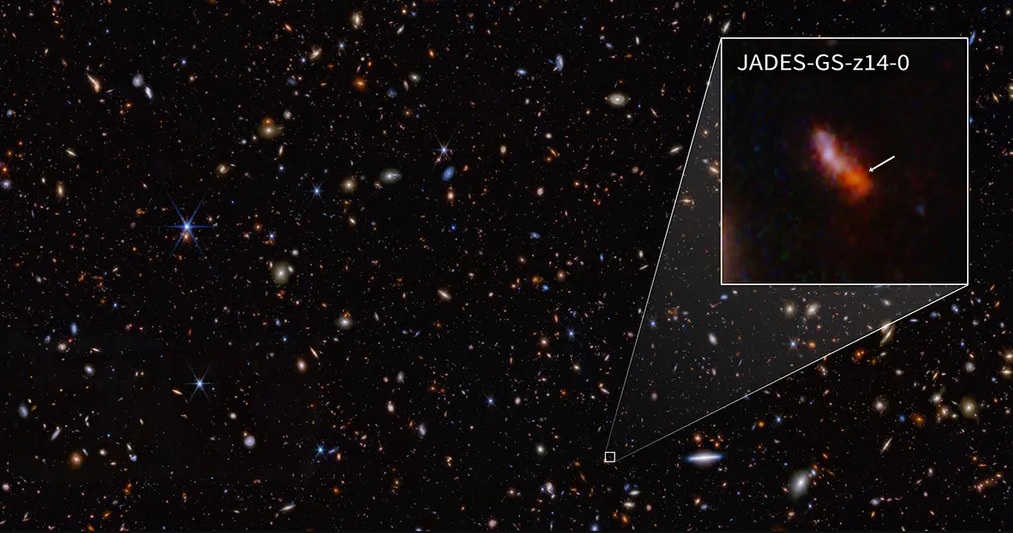 فمجرّة JADES-GS-z14-0 التي اكتُشفت العام الفائت بواسطة تلسكوب “جيمس ويب” الفضائي، بعيدة جدا لدرجة أن وصول ضوئها إلى الأرض استغرق 13,4 مليار سنة، وهي مسافة قياسية تتيح رؤيتها كما كانت عندما كان عمر الكون أقل من 300 مليون سنة، بينما يبلغ اليوم 13,8 مليار سنة.
