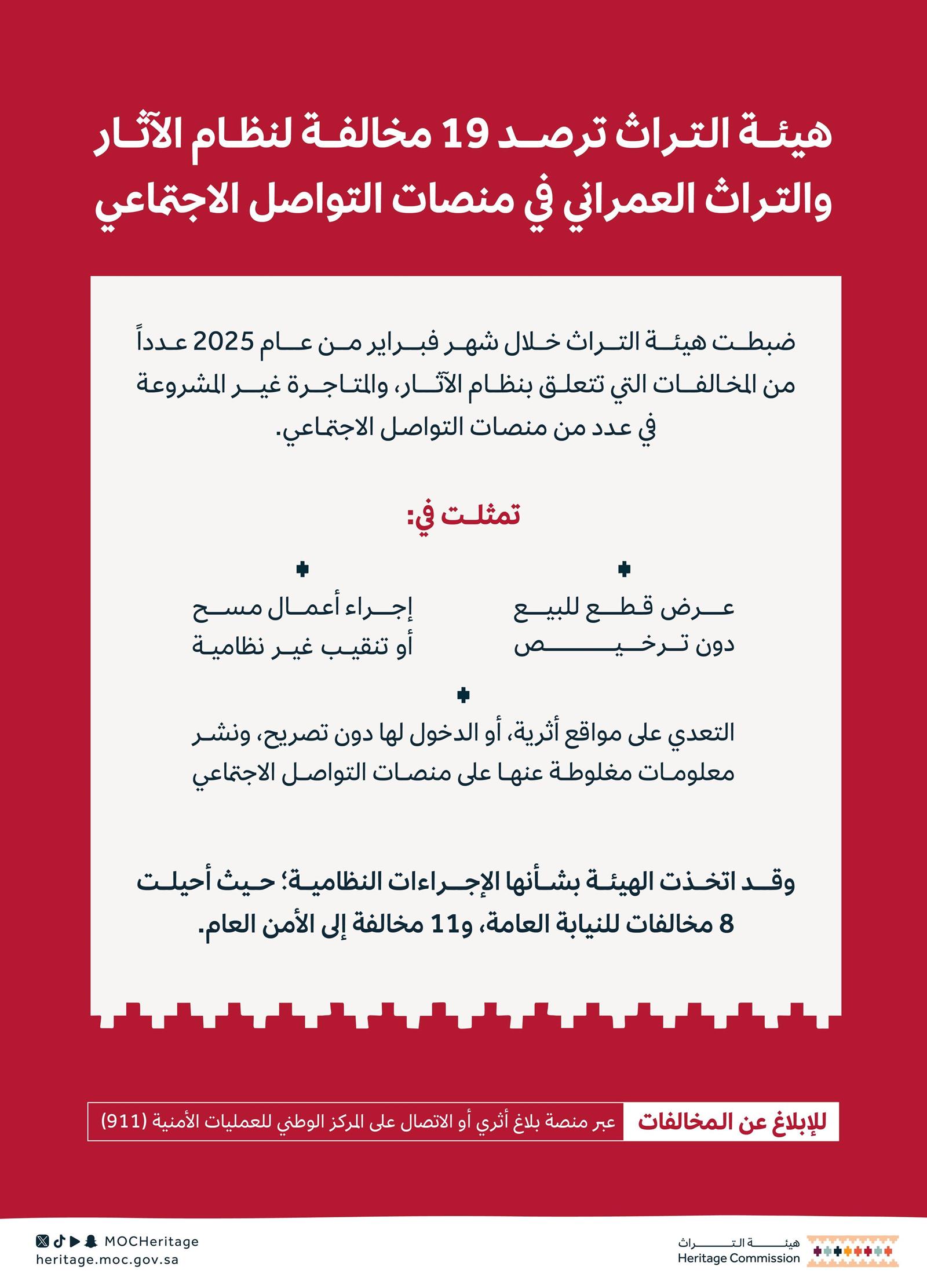رصدت هيئة التراث خلال شهر فبراير لعام 2025 عددًا من مخالفات نظام الآثار والمتاجرة غير المشروعة عبر منصات التواصل الاجتماعي، تمثلت هذه التجاوزات في بيع قطع أثرية دون ترخيص، إضافة إلى عمليات مسح وتنقيب غير نظامية نُشرت تفاصيلها عبر منصات التواصل الاجتماعي.