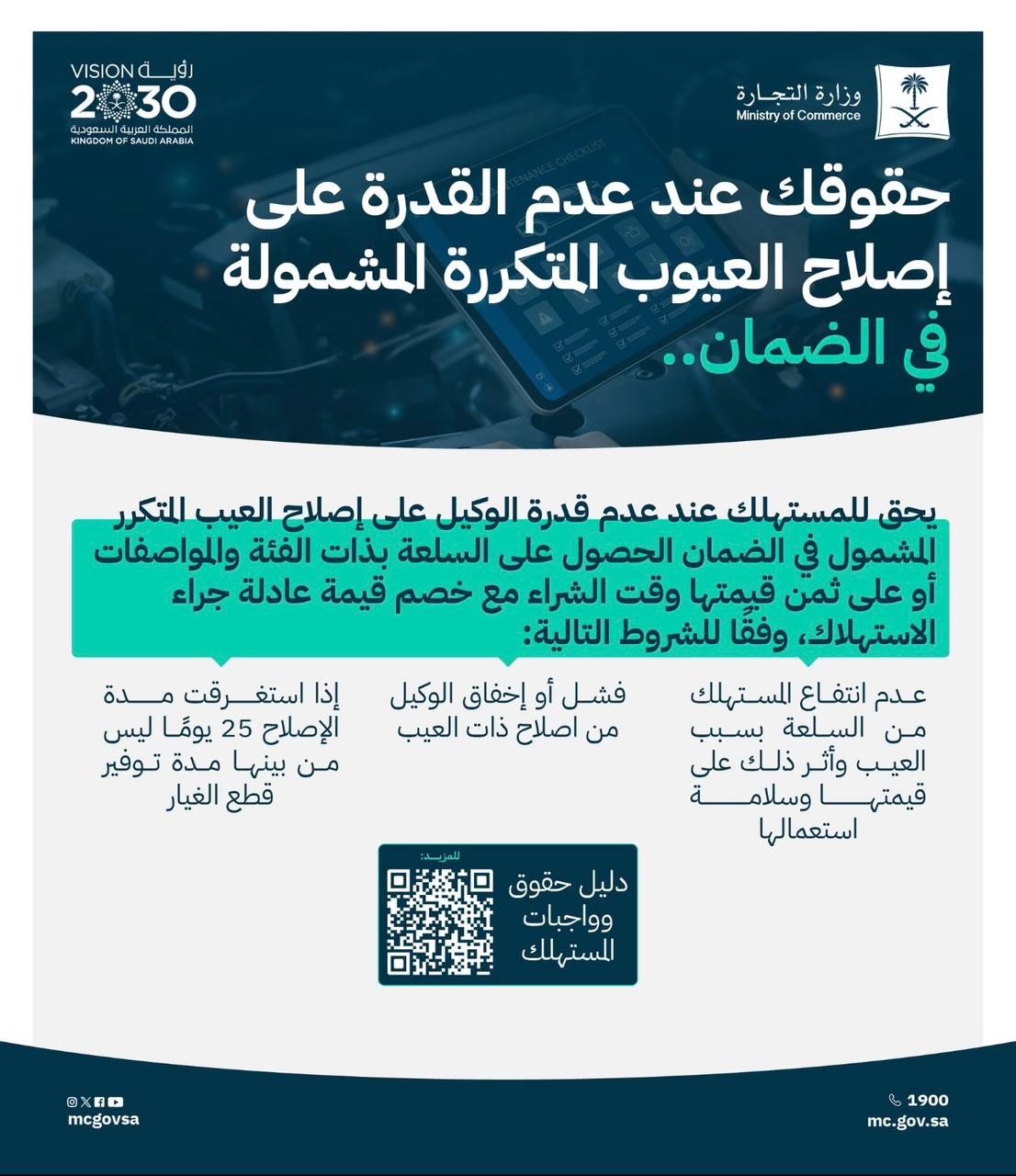 أوضحت “وزارة التجارة” أن حقوق المستهلك تتيح له إمكانية الاستفادة من الضمان في حال عدم قدرة الوكيل على إصلاح العيوب المتكررة في السلع المشمولة بالضمان.