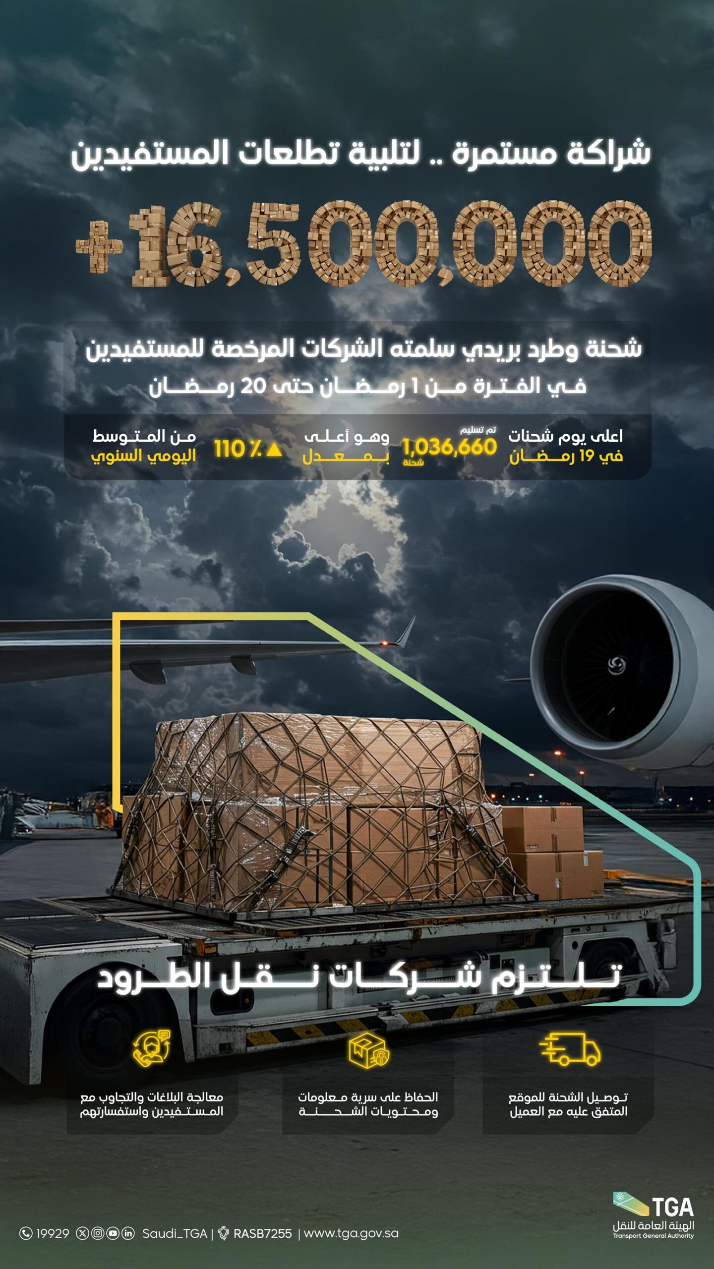 كشفت الهيئة العامة للنقل عن تجاوز عدد الشحنات البريدية التي تم تسليمها من قبل الشركات المرخصة خلال شهر رمضان حاجز 16.5 مليون شحنة، وذلك خلال الفترة من 1 إلى 20 رمضان الجاري، محققةً بذلك أرقامًا قياسية تعكس النمو المتسارع في قطاع نقل الطرود بالمملكة.