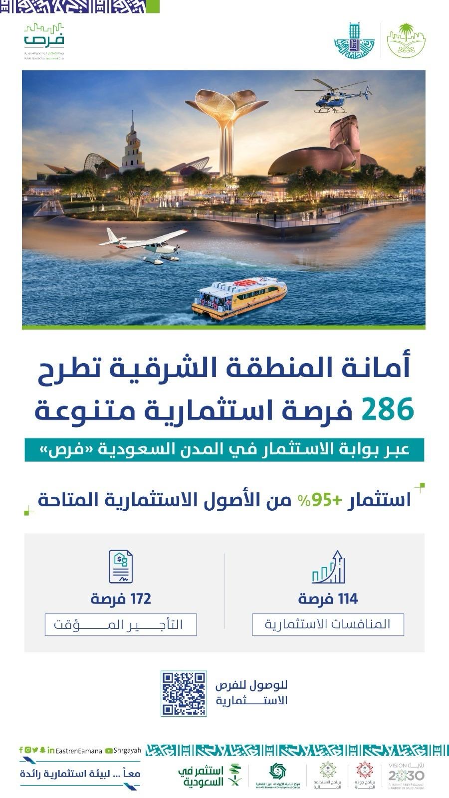 طرحت أمانة المنطقة الشرقية، أكثر من 286 فرصة استثمارية دائمة ومؤقتة في مدن ومحافظات المنطقة الشرقية كافة عبر نماذج استثمارية متنوعة، حيث تتطلب بعض هذه الفرص عروضاً فنية وخبرات تأهيلية لضمان جودة المشاريع الاستثمارية ونوعيتها وقدرة المستثمرين على الإنجاز، بالإضافة إلى تنوع النماذج التعاقدية، ويأتي هذا الطرح استمراراً لجهود الأمانة لإشراك القطاع الخاص بالتنمية وامتداداً للقفزة الاستثمارية بالمنطقة الشرقية، حيث شهدت استقطاب مجموعة من المستثمرين والمشاريع الاستثمارية المميزة، كما قفزت الإيرادات بالأمانة لتتجاوز الملياري ريال في عام 2024 مما يساهم في تحقيق الاستدامة المالية ويعكس ثقة المستثمرين وجاذبية الاستثمارات بالمنطقة الشرقية.
