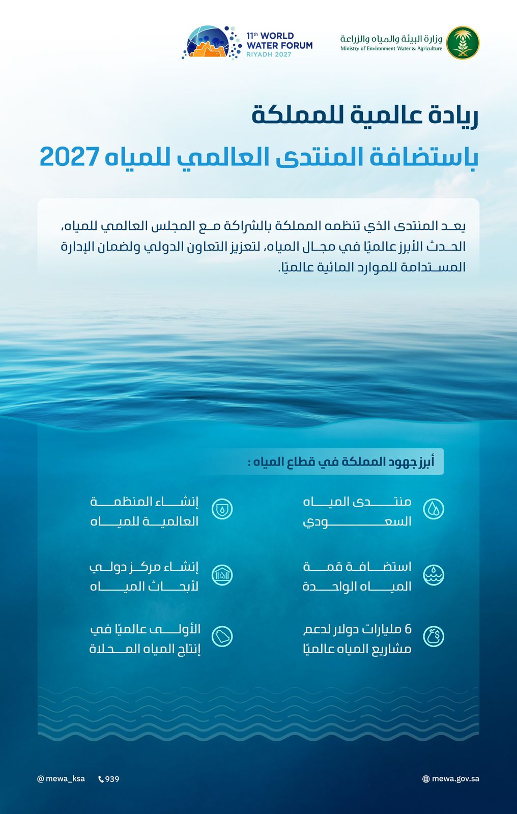 وتتصدر السعودية المشهد العالمي للمياه في مجالات مختلفة، بما في ذلك امتلاكها لأكبر سعة لتحلية المياه، والأقل استهلاكًا للطاقة في تحلية المياه، وتؤدي دوراً رئيسًا في تمويل مشاريع تنمية الموارد المائية على مستوى العالم.