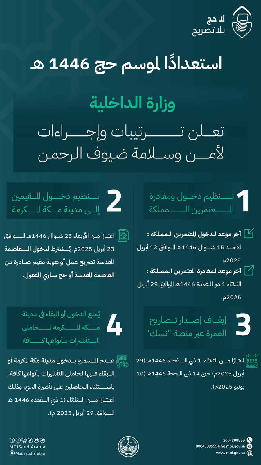 استعدادًا لموسم حج هذا العام 1446 هـ، أعلنت وزارة الداخلية عددًا من الترتيبات والإجراءات التي تهدف إلى المحافظة على سلامة حجاج بيت الله الحرام، وأداء فريضة الحج بأمن ويسر وطمأنينة، وذلك وفق التالي: