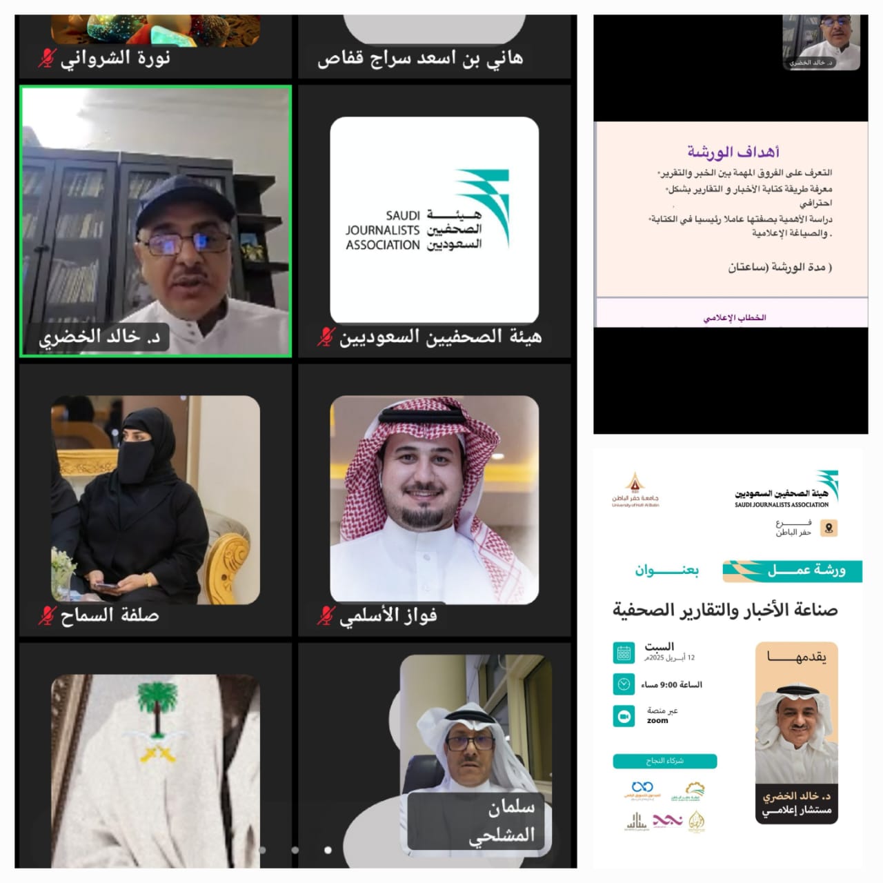 نظم فرع هيئة الصحفيين السعوديين بحفرالباطن، مساء اليوم، ورشة عمل تدريبية عبر منصة Zoom بعنوان “صناعة الأخبار والتقارير الصحفية”، قدّمها المستشار الإعلامي الدكتور خالد الخضري، ضمن برنامج “الصحافة الرقمية والإعلام الجديد “، الذي ينفذ بالتعاون بين هيئة الصحفيين السعوديين وجامعة حفرالباطن.