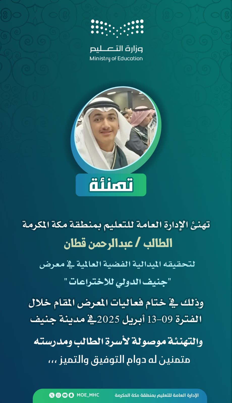 حقق الطالب عبدالرحمن قطان بالإدارة العامة للتعليم بمنطقة مكة المكرمة الميدالية الفضية العالمية في معرض جنيف الدولي للاختراعات وذلك في ختام فعاليات المعرض المقام خلال الفترة 9-13 ابريل 2025 في مدينة جنيف.