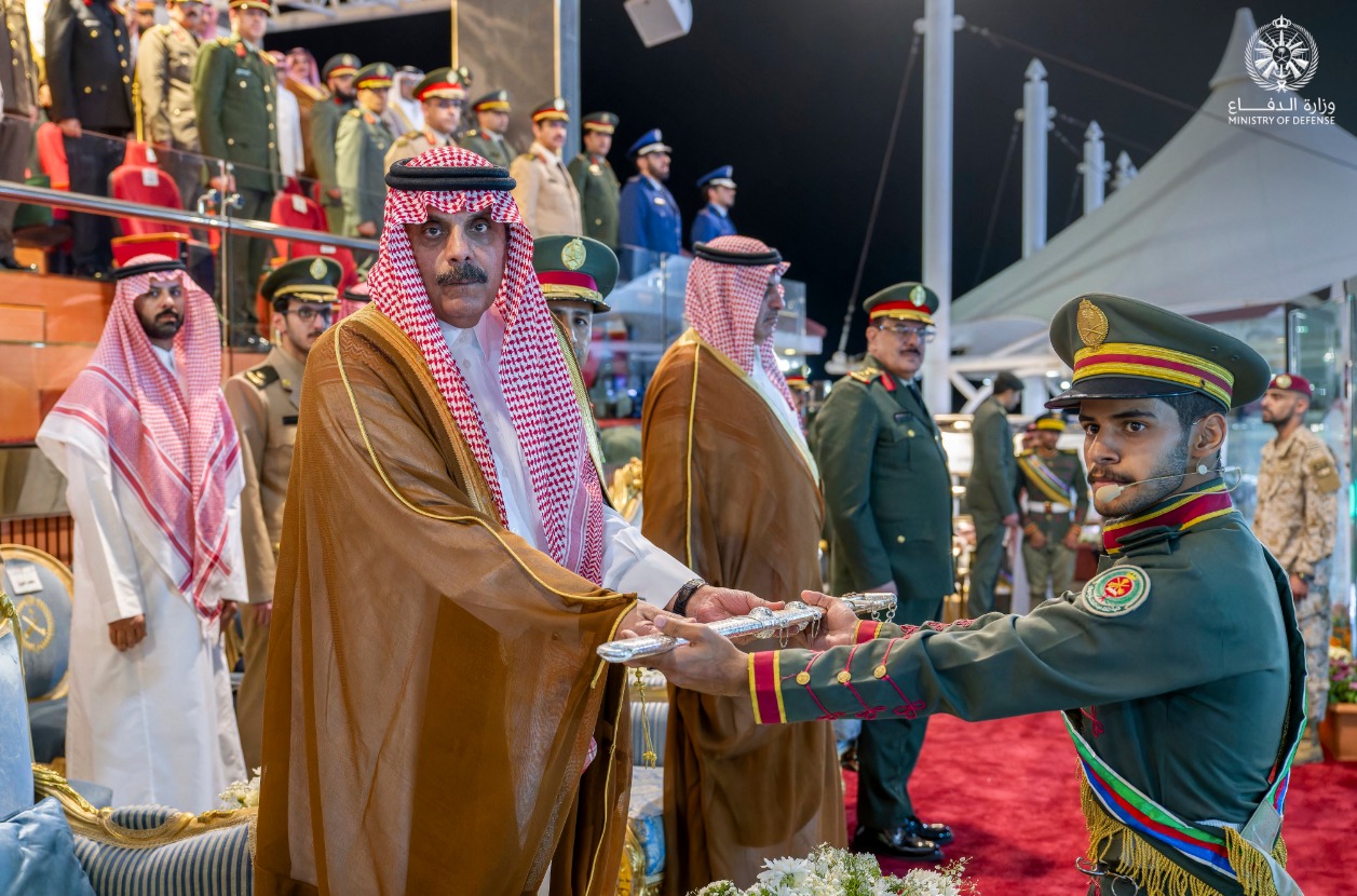 إثر ذلك، جرى العرض العسكري، وسُلِّمت راية الكلية، وأدى الخريجون القسم، ثم أُعلنت النتائج، وتفضل سمو نائب وزير الدفاع بتكريم الطلبة المتفوقين، ثم تسلم سموه هدية تذكارية من قائد الكلية بهذه المناسبة.