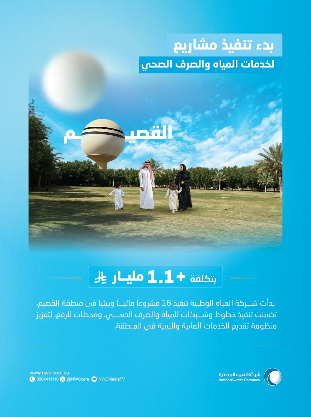 بدأت شركة المياه الوطنية، ممثلة بقطاعها الشمالي تنفيذ (16) مشروعًا مائيًا وبيئيًا في أنحاء متفرقة من منطقة القصيم بكُلفة إجمالية تجاوزت 1.1 مليار ريال، وذلك لزيادة نسب التغطية بالخدمات المائية والبيئية، وتحسين جودتها، ومواكبة الطلب المتزايد.