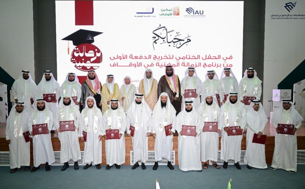 احتفلت جمعية تمكين الأوقاف، بالشراكة مع جامعة الإمام عبدالرحمن بن فيصل ممثلة ببيت الخبرة الوقفية، مساء أمي الأحد، بتخريج الدفعة الأولى من برنامج الزمالة المهنية في الأوقاف، وذلك في مقر الجامعة بمدينة الدمام، بمبنى العمادات المساندة، بحضور عدد من أصحاب المعالي والفضيلة والقيادات والمهتمين بالقطاع الوقفي، وبدعم من مؤسسة الضويان الخيرية، ومؤسسة عبدالرحمن بن صالح الراجحي وعائلته الخيرية، ومؤسسة حمد الحصيني وعائلته الخيرية، وجمعية منفعة كشريك علمي.
