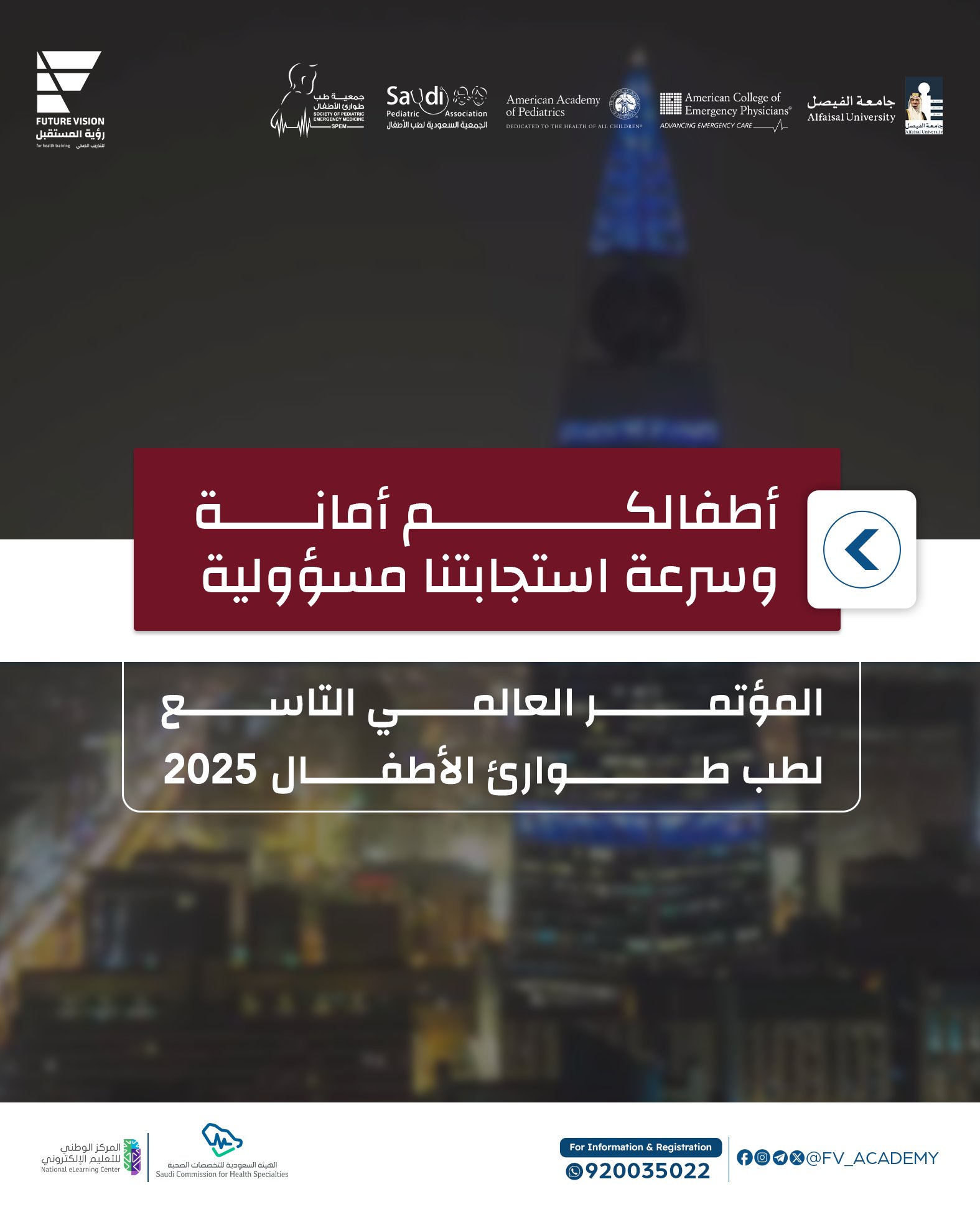انطلقت اليوم فعاليات المؤتمر العالمي التاسع لطب طوارئ الأطفال 2025، بتنظيم من جمعية طب طوارئ الأطفال السعودية، وبالشراكة مع جامعة الفيصل وجمعية الأطفال السعودية، وبمشاركة الجمعية الأمريكية لطب الأطفال والكلية الأمريكية لأطباء الطوارئ. ويستمر المؤتمر على مدى ثلاثة أيام، من 22 إلى 24 أبريل، وقد حظي باعتماد 24 ساعة تعليم طبي مستمر من الهيئة السعودية للتخصصات الصحية، إلى جانب 21 ساعة من كل من الجمعية الأمريكية لطب الأطفال والكلية الأمريكية لأطباء الطوارئ.
