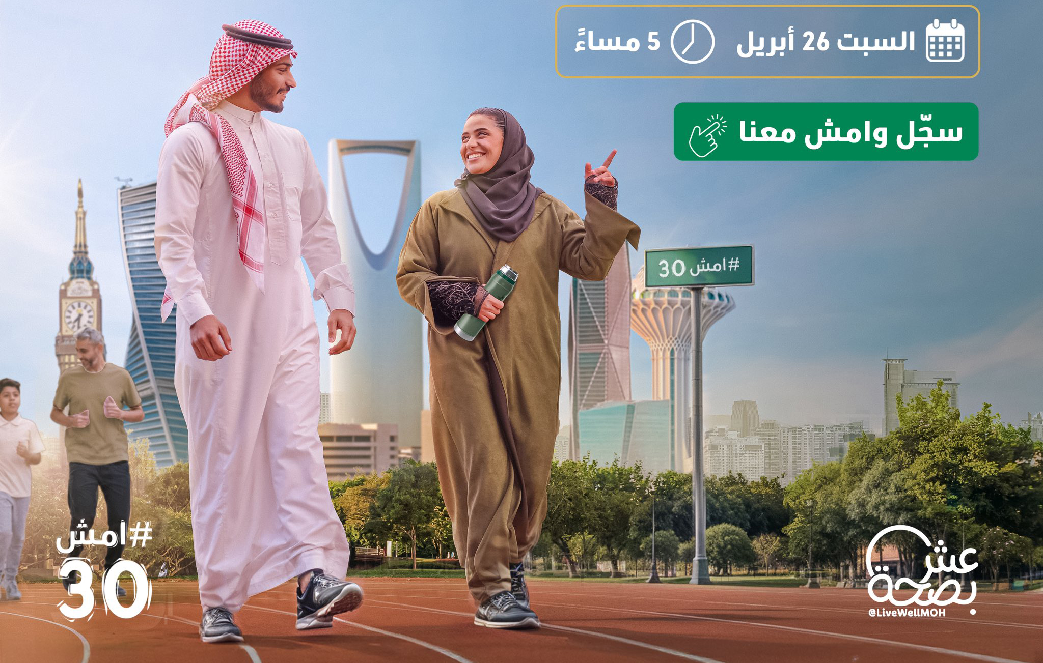 ويأتي تنظيم هذه الفعالية في إطار التزام وزارة الصحة بتعزيز مفاهيم الصحة الوقائية، وتمكين المجتمع من تبني ممارسات صحية مستدامة تسهم في تحسين جودة الحياة والارتقاء بالصحة العامة، ودعت الوزارة جميع المواطنين والمقيمين إلى المبادرة بالمشاركة في هذه الفعالية المجتمعية والتسجيل المسبق عبر الرابط الإلكتروني التالي: https://walking30.moh.gov.sa/pages/pathsOf30.html.