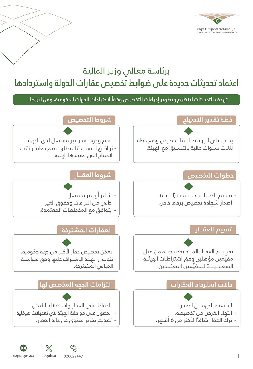 اعتمد مجلس إدارة الهيئة العامة لعقارات الدولة برئاسة معالي وزير المالية الأستاذ محمد بن عبدالله الجدعان تحديثات جديدة على ضوابط تخصيص عقارات الدولة واستردادها؛ وذلك بهدف تطوير وتحسين وتنظيم عملية تخصيص العقارات وفقًا لاحتياجات الجهات الحكومية.