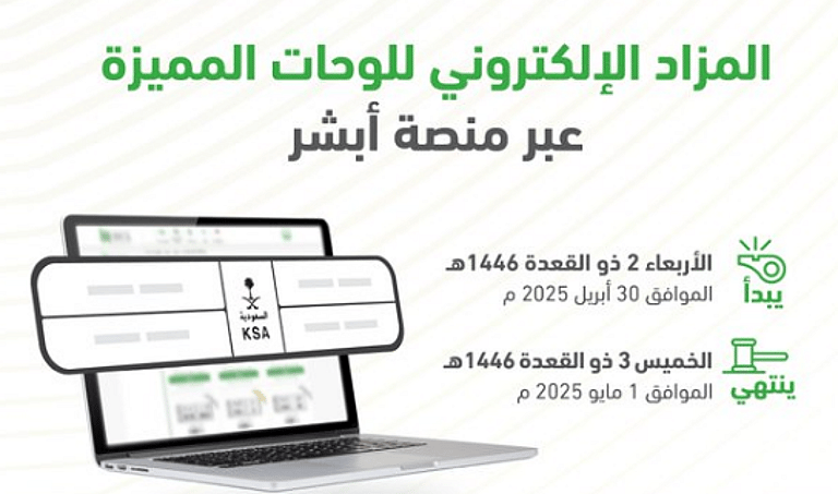 ويبدأ طرح المزاد عبر منصة أبشر التي تمكّن الراغبين في شراء اللوحات المميزة من المشاركة في المزاد إلكترونياً.