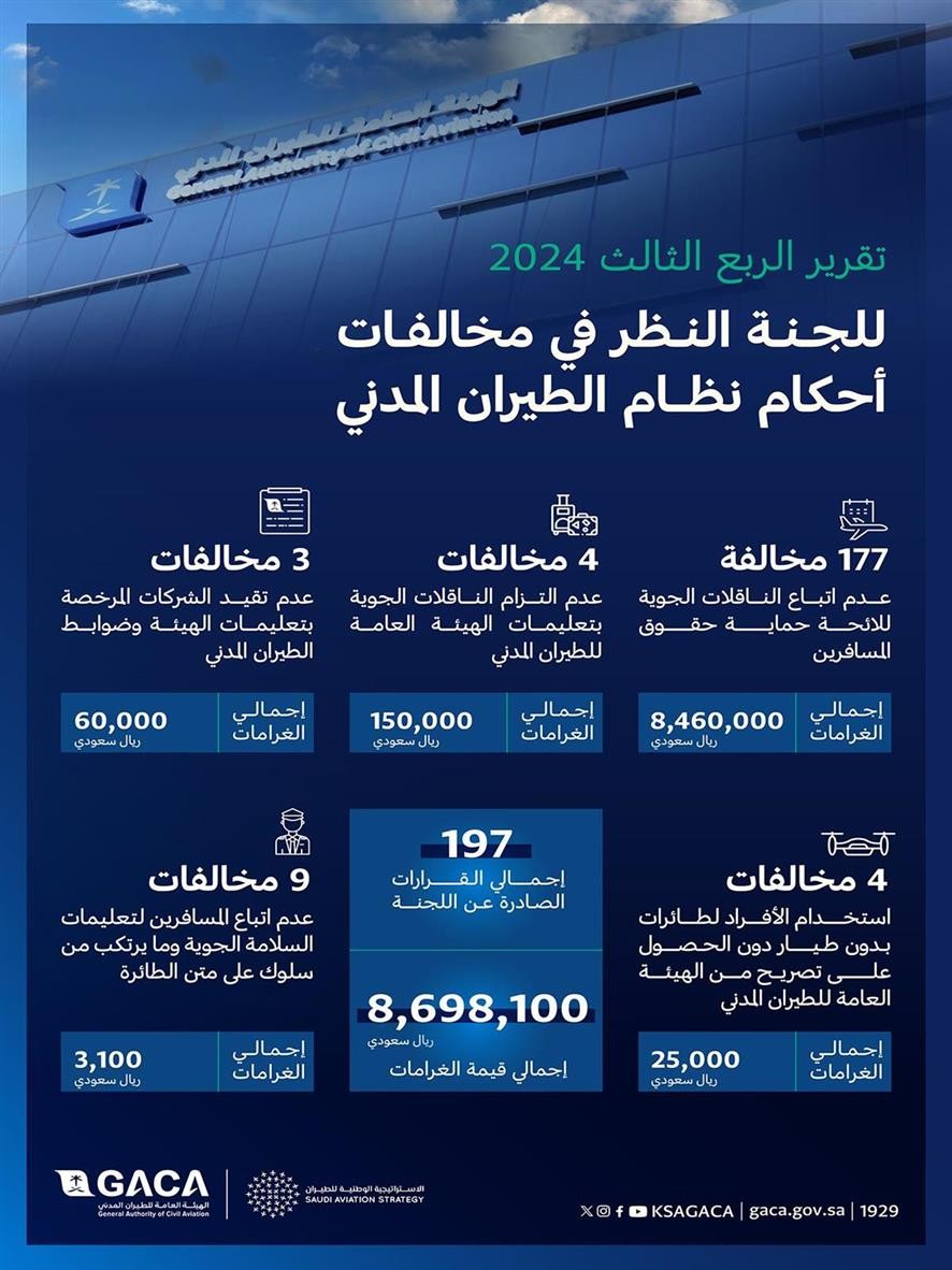 أصدرت الهيئة العامة للطيران المدني مُمثلةً باللجنة المعنية بالنظر في مخالفات أحكام نظام الطيران المدني، تقريرها للربع الثالث لعام 2024م، الذي تضمن إصدار (197) مخالفة، شملت فرض غرامات مالية بلغت (8.698.100) ريال على الكيانات والأفراد المخالفين لنظام الطيران المدني واللوائح التنفيذية والتعليمات الصادرة عن الهيئة.