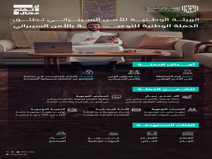 وأوضحت الهيئة أن الحملة الوطنية للتوعية بالأمن السيبراني تأتي استمرارًا لجهودها المبذولة في التوعية السيبرانية على المستوى الوطني، وتضم مجموعة من المبادرات والفعاليات الميدانية والبرامج النوعية التي تشمل “تنظيم المعرض المتنقل للتوعية بالأمن السيبراني في عددٍ من الجهات الوطنية، وإطلاق المعرض التفاعلي في المدينة الرقمية بالرياض، وتنفيذ جلسات توعوية لقيادات ومنسوبي الجهات الوطنية، وإصدار مجموعة من الأدلة الإرشادية للتوعية بالأمن السيبراني” إلى جانب توفير حقيبة توعوية خاصة بالحملة لأكثر من 900 جهة وطنية لتوعية منسوبيها بالأمن السيبراني، وإطلاق حملة توعوية بعنوان “لا تفتح مجال” وذلك بالتعاون مع الجهات الوطنية من القطاعين العام والخاص.