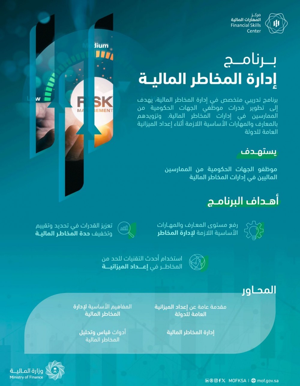 يذكر أن برنامج إدارة المخاطر المالية يُعد أحد مبادرات مركز المهارات المالية الهادفة إلى تطوير قدرات موظفي الجهات الحكومية من الممارسين في إدارات المخاطر المالية، وتزويدهم بالمعارف والمهارات الأساسية اللازمة أثناء إعداد الميزانية العامة للدولة.