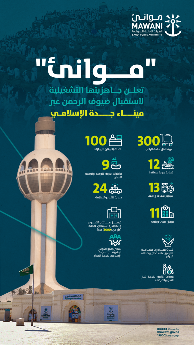 أعلنت الهيئة العامة للموانئ “موانئ” عن اكتمال خططها وتجهيزاتها التشغيلية لاستقبال حجاج بيت الله الحرام عبر ميناء جدة الإسلامي، وسط منظومة متكاملة من الخدمات التشغيلية، بالتعاون والتنسيق مع مختلف القطاعات والأجهزة الحكومية والأهلية والشركات المُشغلة ذات العلاقة، تماشيًا مع توجهات القيادة -رعاها الله، بتسهيل حركة وإجراءات استقبال الحجاج ومغادرتهم بكل يسر وسهولة.