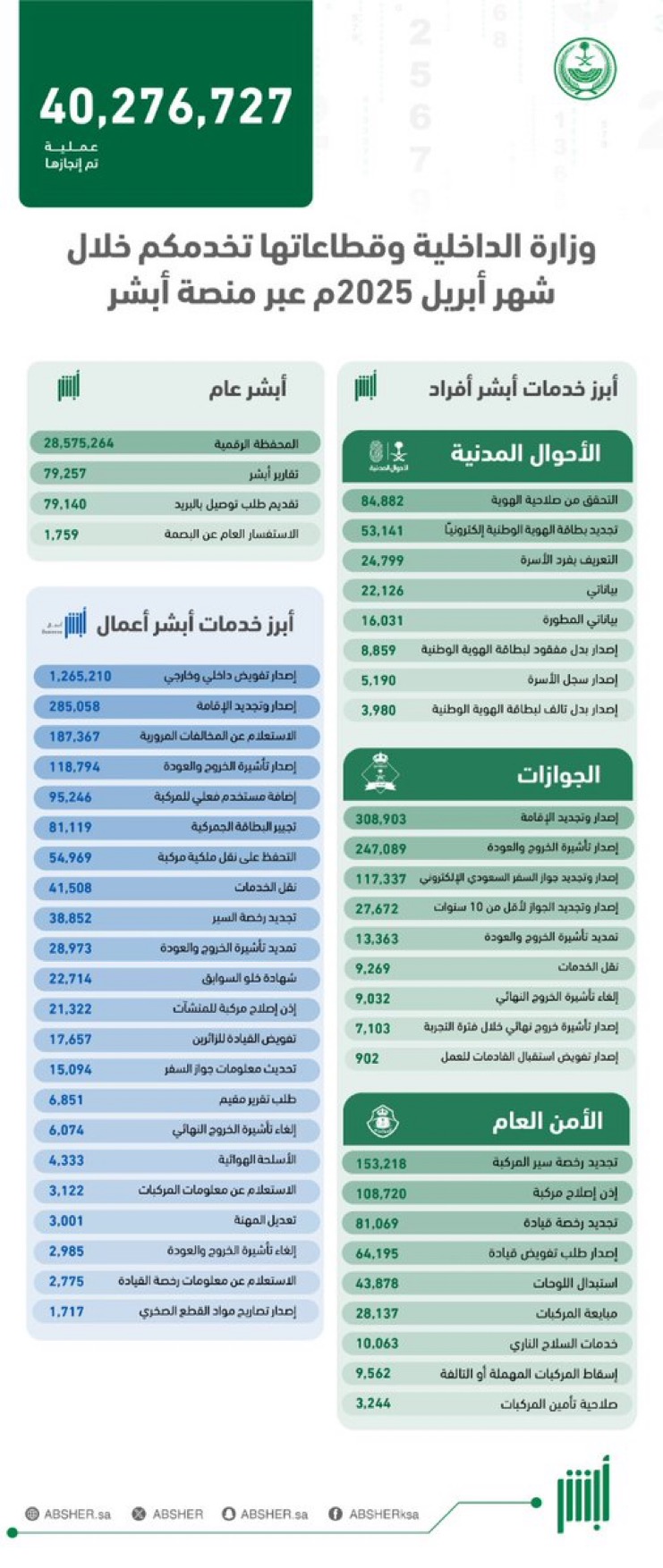أكثر من 40 مليون عملية إلكترونية عبر منصة “أبشر” في أبريل 2025م