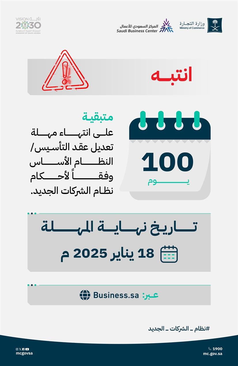 دعت وزارة التجارة الشركات إلى المبادرة لتعديل عقد التأسيس / النظام الأساس وفقا لأحكام نظام الشركات الجديد قبل انتهاء المهلة الممنوحة، حيث تبقى 100 يوم على انتهائها، وذلك في 18 يناير 2025م.