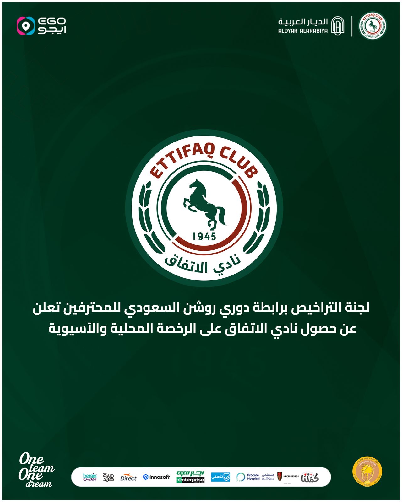 اعلن نادي الاتفاق عن حصوله رسميًا على الرخصة المحلية والآسيوية للموسم الرياضي 2025-2026، والتي تُمكّنه من تسجيل اللاعبين وإبرام التعاقدات وفقًا للوائح المعتمدة.
