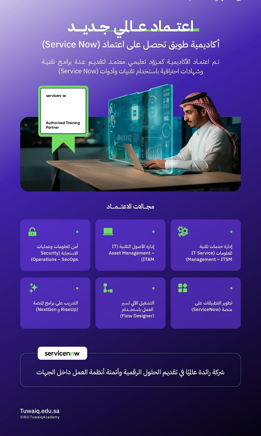 أعلنت أكاديمية طويق حصولها على اعتماد عالمي جديد من شركة “ServiceNow” بوصفها أول جهة تعليمية في الشرق الأوسط تحصل على هذا الاعتماد، لتقديم معسكرات وبرامج احترافية باستخدام تقنيات وأدوات المنصة العالمية للشركة، بهدف بناء القدرات الوطنية في مختلف المجالات التقنية.