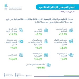 وأفادت نتائج النشرة عن ارتفاع الرقم القياسي لنشاط التعدين واستغلال المحاجر لشهر أغسطس عام 2024م بنسبة (0.8%) مقارنة بالشهر المماثل من العام السابق (أغسطس 2023م). كما ارتفع الرقم القياسي لنشاط الصناعة التحويلية لشهر أغسطس عام 2024م بنسبة (1.1%) مقارنة بالشهر المماثل من العام السابق (أغسطس 2023م). كما سجل الرقم القياسي الفرعي لنشاط إمدادات الكهرباء والغاز والبخار وتكييف الهواء ارتفاعًا بنسبة( 4.1%)، فيما سجل الرقم القياسي الفرعي لنشاط إمدادات المياه والصرف الصحي وأنشطة إدارة النفايات ومعالجتها انخفاضًا بنسبة( 0.9%)، وذلك مقارنةً بشهر أغسطس من العام السابق.