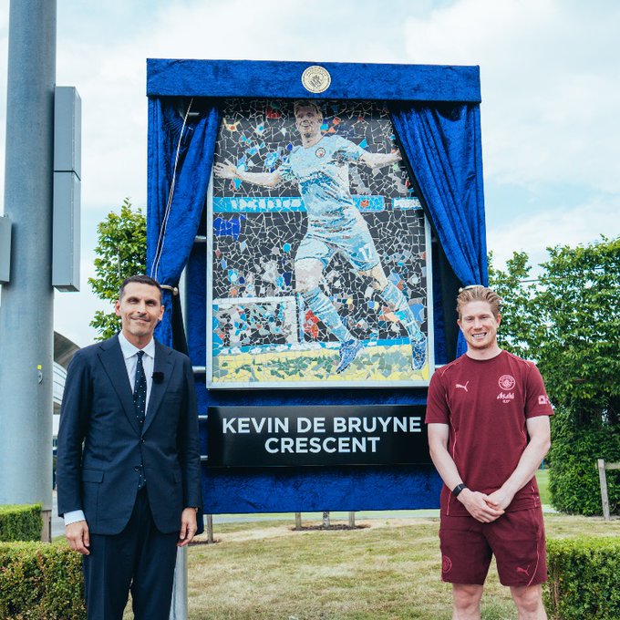 كشف خلدون المبارك رئيس مجلس إدارة مانشستر سيتي الإنجليزي اليوم الثلاثاء عن لوحة فسيفساء خاصة بالنجم البلجيكي كيفين دي بروين كما أطلق اسمه على أحد الطرق داخل أكاديمية مانشستر سيتي لكرة القدم، وذلك تكريمًا لمسيرته الأسطورية مع النادي.