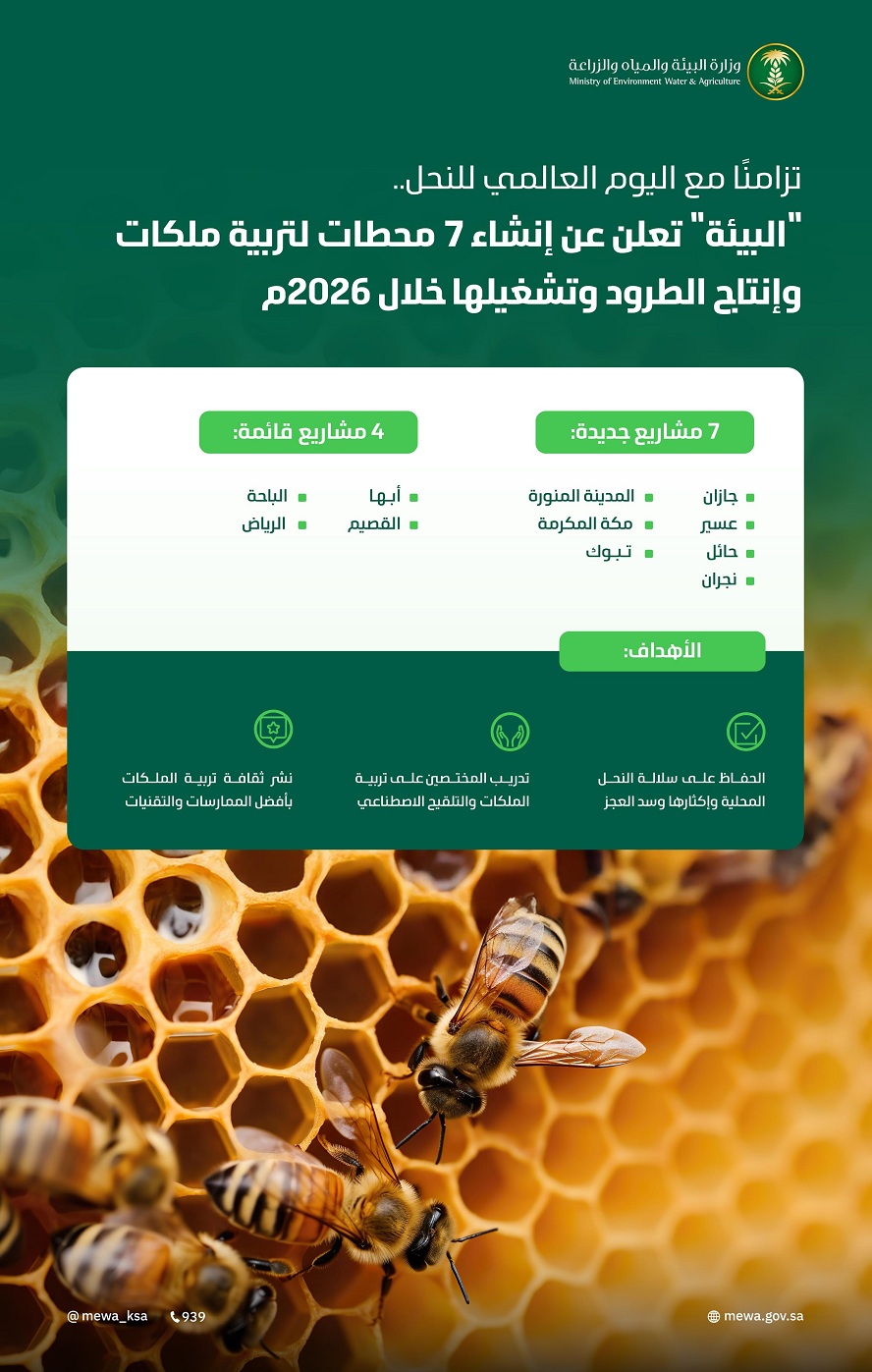 “البيئة” تعلن إنشاء 7 محطات لتربية ملكات النحل وإنتاج الطرود وتشغيلها خلال 2026م