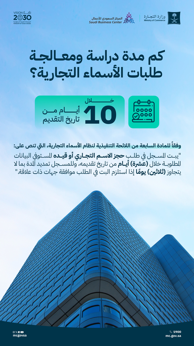 وأشارت الوزارة إلى أن مدة دراسة ومعالجة الاسم التجاري تتم خلال عشرة أيام من تاريخ تقديم الطلب المستوفي البيانات، وذلك وفقاً للمادة السابعة من اللائحة التنفيذية لنظام الأسماء التجارية التي تنص على: “يبت المسجل في طلب حجز الاسم التجاري أو قيده المستوفي البيانات المطلوبة خلال (عشرة) أيام من تاريخ تقديمه، وللمسجل تمديد المدة بما لا يتجاوز (ثلاثين) يومًا إذا استلزم البت في الطلب موافقة جهات ذات علاقة .