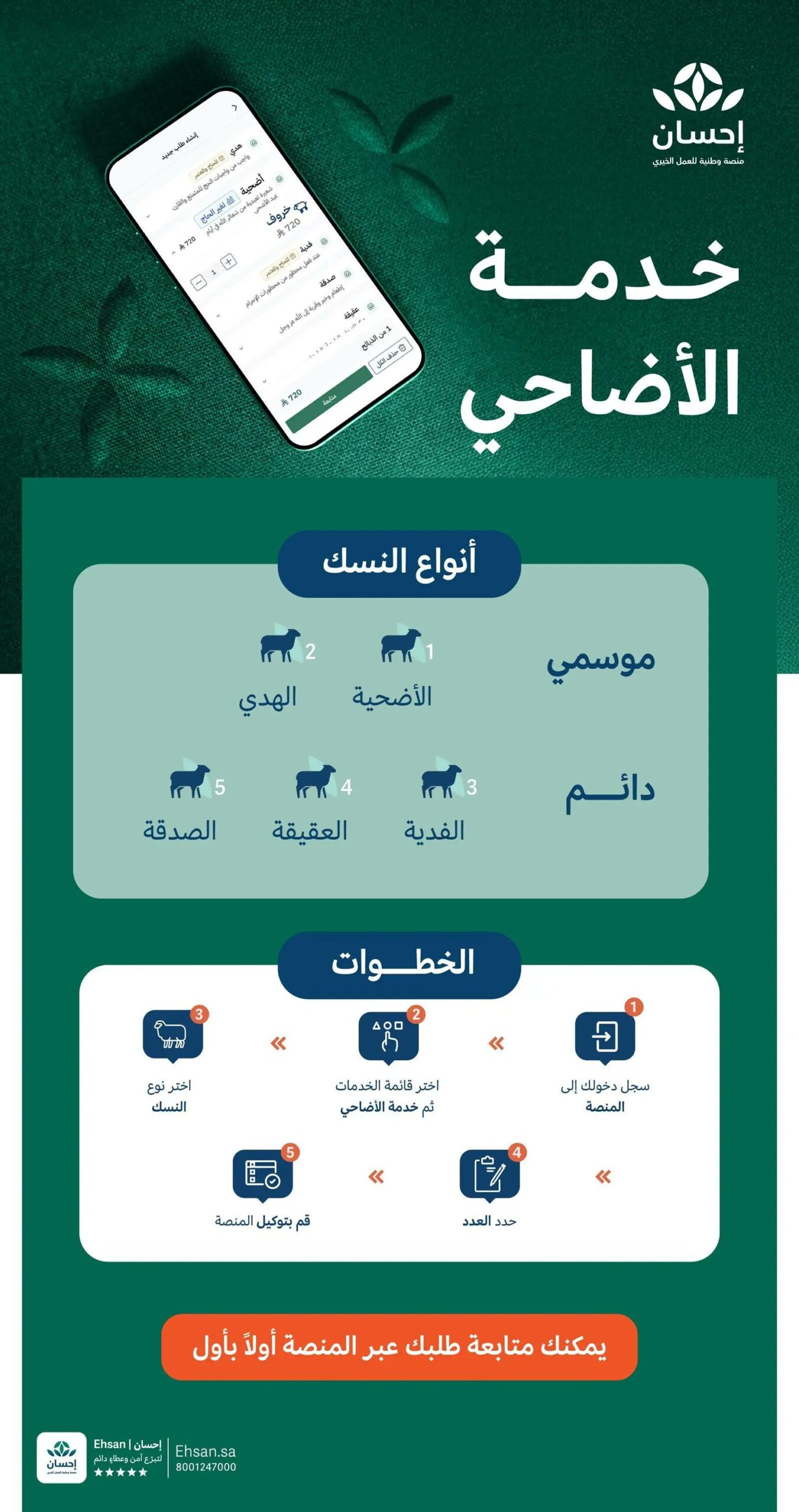 وأوضحت المنصة أنه يمكن للمضحين أداء النسك بخطوات يسيرة، تتمثل في تسجيل الدخول إلى المنصة، ثم اختيار قائمة برامجنا، بعد ذلك اختيار برنامج الأضاحي، ثم اختيار نوع النسك المراد إخراجه، وتحديد عدده ثم توكيل المنصة، كما يمكن للمضحين متابعة حالة الطلب عبر المنصة أولًا بأول، مبينة أن البرنامج يوفر خيارات متنوعة تلبي احتياجات المتبرعين، تشمل: الأضحية والهدي خلال موسم الحج، والفدية، والعقيقة، والصدقة على مدار العام.