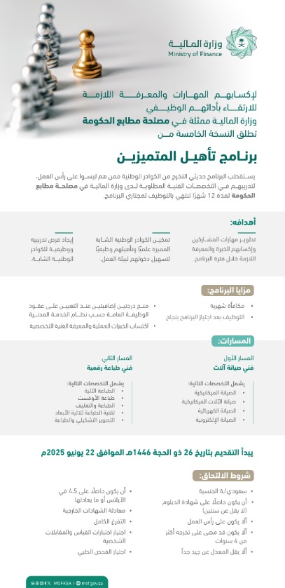 أعلنت وزارة المالية ممثلة في مصلحة مطابع الحكومة عن إطلاق النسخة الخامسة من برنامج تأهيل المتميزين، والذي يسعى إلى تمكين حديثي التخرج من الكوادر الوطنية المميزة؛ من خلال تدريبهم وتطوير قدراتهم ومهاراتهم الفنية، وإكسابهم المعرفة اللازمة للارتقاء بأدائهم الوظيفي، بما يواكب احتياجات الوزارة ويرفع من مستوى الجاهزية الوظيفية للكوادر المتخصصة.