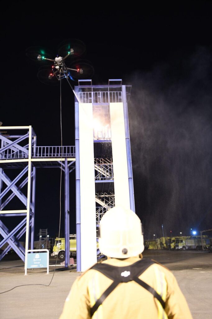 وتعمل الطائرة لمدة (12) ساعة بارتفاعات عالية وحمولة تصل إلى نحو (40) كيلوجرامًا بنظام إطفاء متعدد الأغراض وأنظمة إنقاذ وتحكم وأمان وكاميرات حرارية، مع إمكانية بث مباشر للموقع وقابلية الربط بمركز القيادة والتحكم.